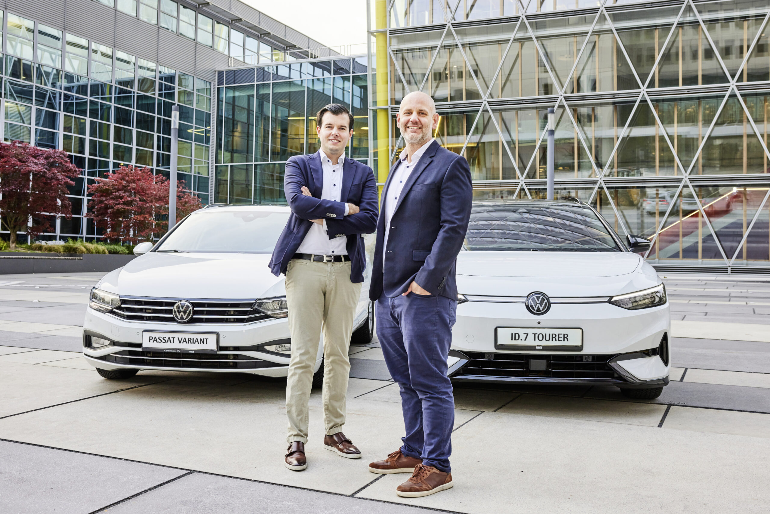 So sieht bei uns der Wandel auf vier Rädern aus: Über die Hälfte unserer Dienstwagenflotte ist inzwischen elektrifiziert. Bis 2028 wollen wir die 75-Prozent-Marke erreichen. Die Aussichten stehen gut: „In diesem Jahr sind von über 100 neu zugelassenen Fahrzeugen fast 95 Prozent elektrisch betrieben”, so Michael Heimann, Bereichsleiter Dienstleistungen (rechts). Was früher der VW Passat war, ist heute der ID.7 – ein besonders gefragtes Modell unter den Dienstwagen fahrenden LVMer:innen.